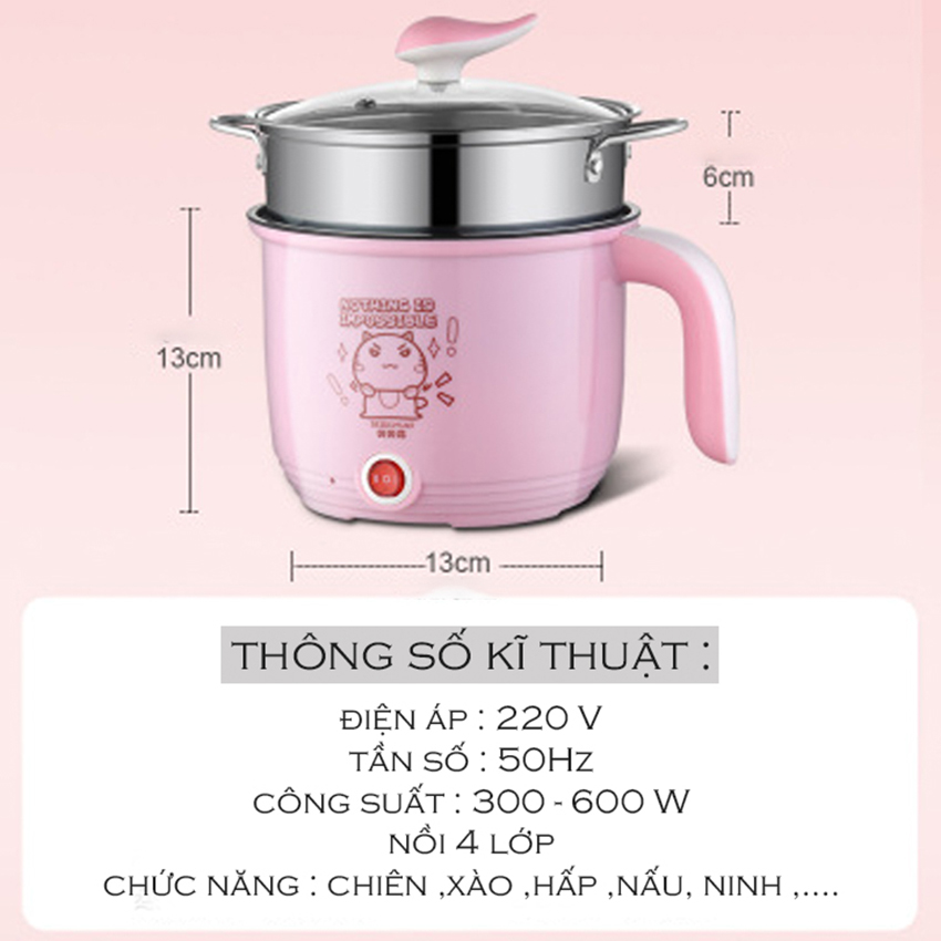 Nồi lẩu hấp mini đa năng kèm khay hấp, lõi chống dính có thể chiên xào Ca điện nấu ăn cá nhân thích hợp cho văn phòng. Nồi được tặng kèm bộ bát - đũa - thìa - muôi chất liệu nhựa lúa mạch cao cấp. Nồi lẩu hấp mini là sản phẩm đa năng được thiết kế theo tiêu chí nhỏ gọn, tiện lợi để phục vụ cho bữa ăn hàng ngày của bạn. + Nồi lẩu hấp đa năng có kèm khay hấp, bạn có thể vừa làm món luộc bên dưới vừa hấp đồ bên trên hoàn toàn cùng lúc, tiết kiệm được thời gian. + Lõi nồi được phủ men đá chống dính sử dụng đa năng như một chiếc chảo chống dính hoặc một chiếc nồi nấu ăn thông dụng khác. Không làm cháy đồ ăn, không bám dính, dễ dàng vệ sinh. Bạn có thể sử dụng thay thế để làm các món chiên, xào, nấu… + Có tay cầm tiện lợi khi sử dụng, cầm nắm, di chuyển mà không gây an toàn hay vướng víu. + Thân nồi được bọc nhựa ABS cao cấp. loại nhựa cứng chuyên dụng, chịu được nhiệt, không bị nóng khi sử dụng. Đảm bảo an toàn khi nấu ăn, đặc biệt sẽ không gây nên tình trạng khét mùi nhựa. + Nắp vung được làm bằng thủy tinh cường lực, chịu nhiệt tốt. + Kèm khay hấp cách thủy đa năng tiện dụng. + Sử dụng cho nhu cầu nấu ăn cá nhân để chế biến đồ ăn mà không cần mất nhiều thời gian chuẩn bị. Rất thích hợp cho các bạn sinh viên, học sinh, nhân viên văn phòng… tiện lợi, nhỏ gọn, có thể di động sử dụng ở mọi nơi. Còn được dân văn phòng gọi là Ca điện mini thần thánh.