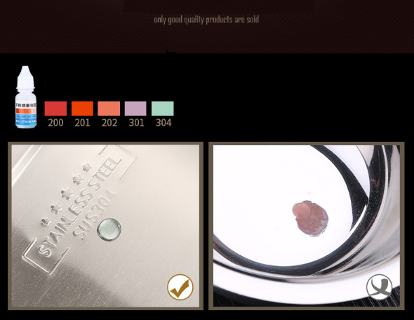 Với inox SUS304 và 201 cách thử tốt là dùng axit hoặc thuốc thử chuyên dụng. Khi sử dụng axit, inox SUS 304 gần như không có phản ứng gì, inox 201 sẽ bị sủi bọt và có phản ứng xảy ra. Inox 430 ta có thể thử bằng cách đơn giản là cho nam châm lại gần sẽ có cảm giác hít xảy ra.
