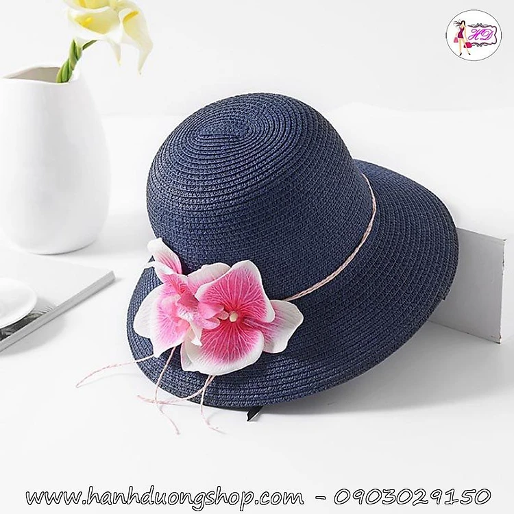 Nón đi biển du lịch nữ vành nhỏ gắn nơ hoa lan dễ thương, chất liệu cói giữ dáng, có dây rút size bên trong nón - Hạnh Dương