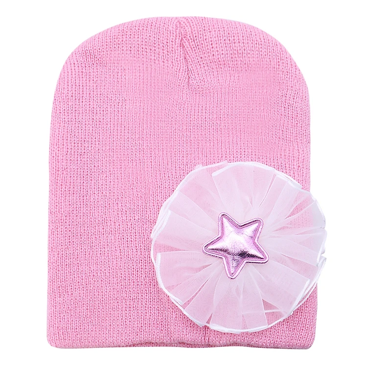 - Kiểu mũ chụp, trang trí bằng hình bông hoa xinh xắn tăng thêm phần điệu đà cho bé.