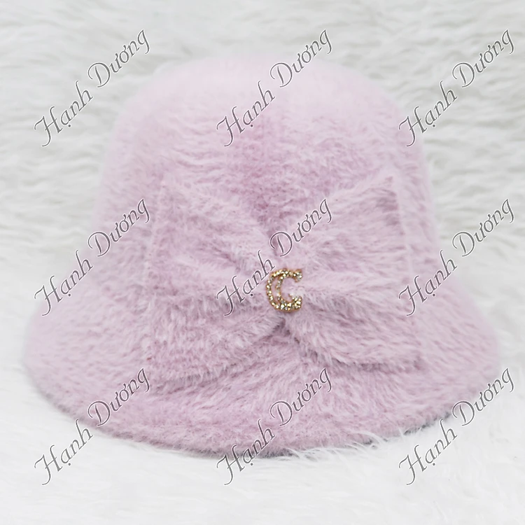Nón lông xù vành cúp gắn nơ dễ thương kèm logo chữ G, vành rộng 5cm, chất liệu vải mềm mại