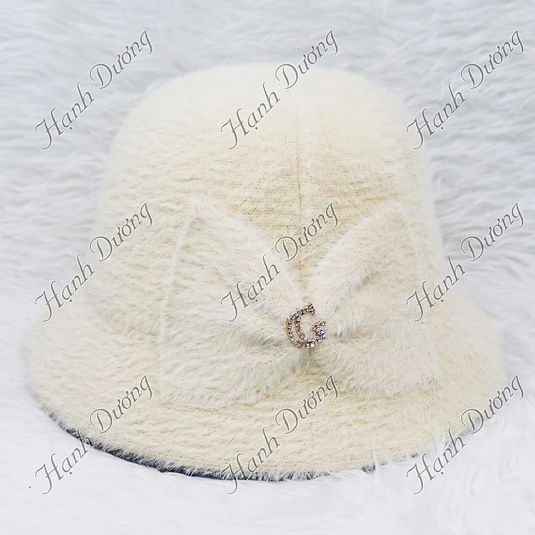 Nón lông xù vành cúp gắn nơ dễ thương kèm logo chữ G, vành rộng 5cm, chất liệu vải mềm mại