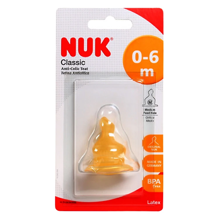 - Vị trí lỗ tiết sữa của NUK nằm ở bề mặt trên làm cho tia sữa không đi thẳng vào họng giúp bé tránh bị sặc khi bú, đường cong trên thân được thiết kế phù hợp với cử động gợn sóng của lưỡi.
