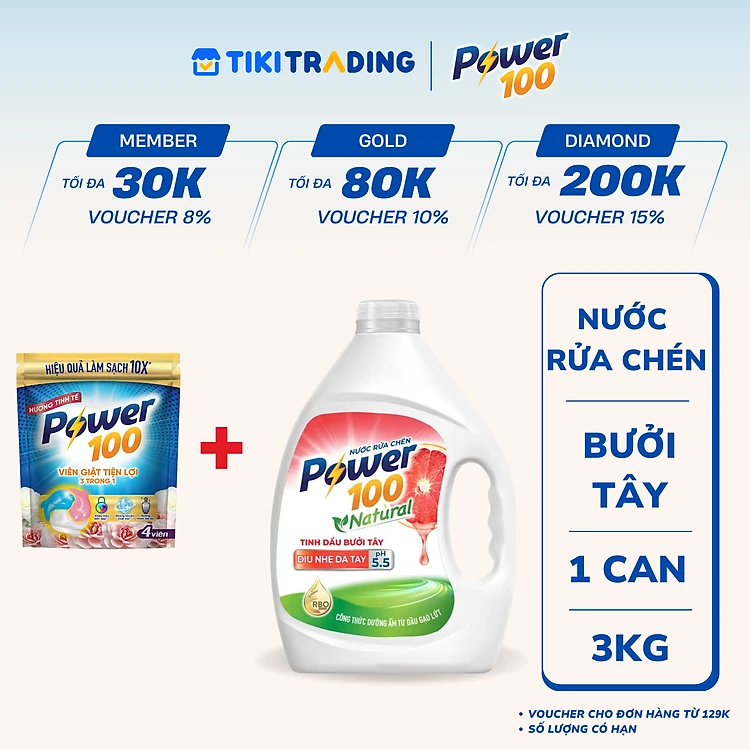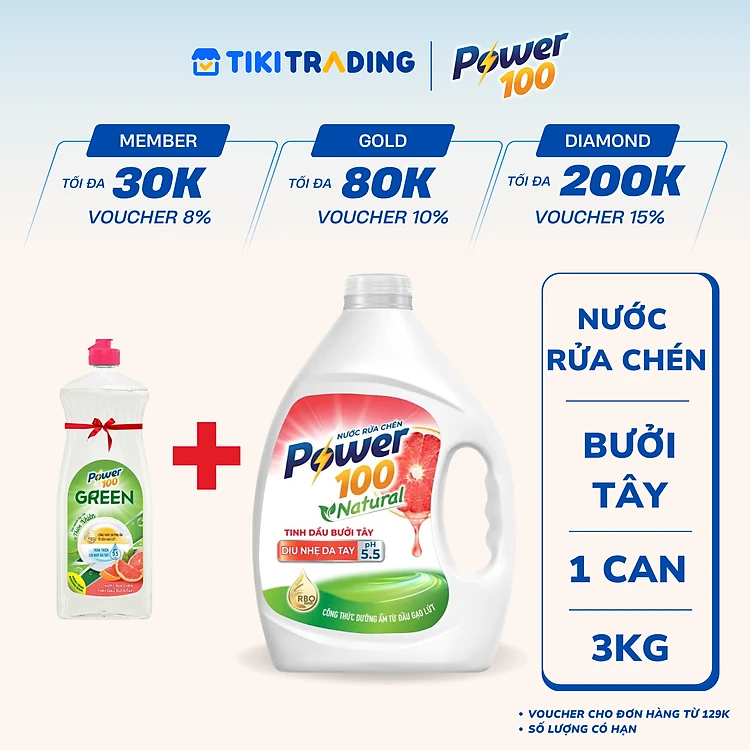 Can Nước Rửa Chén POWER100 Natural Tinh Dầu Bưởi Tây 3KG