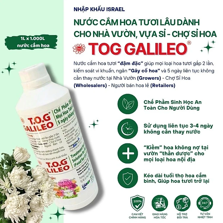 Nước Dưỡng Hoa Tươi Lâu TOG GALILEO nhập khẩu Israel giúp hoa tươi lâu gấp 2 lần và 3-5 ngày không cần thay nước tại nhà vườn, chợ sỉ hoa (1L "đậm đặc" pha 1.000L nước)