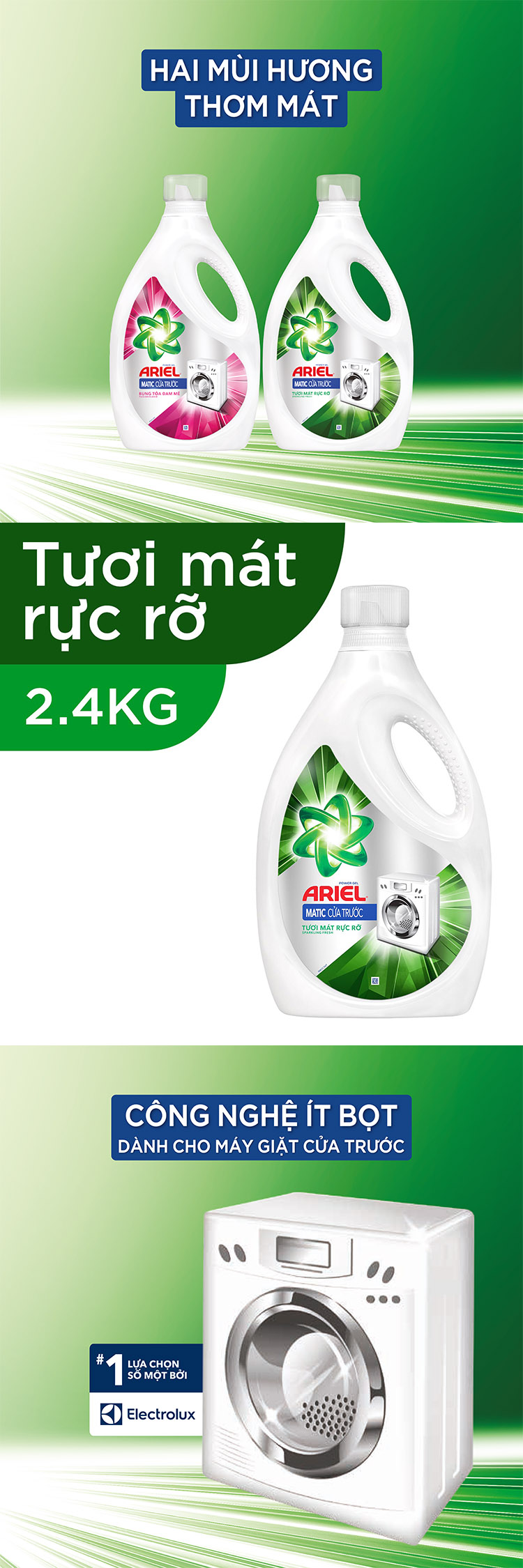 - Nước Giặt Ariel Cửa Trước Hương Tươi Mát Dạng Chai (2.4Kg/Chai) là Lựa chọn số 1 bởi Electrolux cho máy giặt cửa trước. Với công thức ít bọt và khả năng làm sạch hoàn hảo, khử mùi hôi, Ariel Matic Cửa trước là lựa chọn hoàn hảo cho công cuộc giặt giũ cùng máy giặt cửa trước của gia đình!