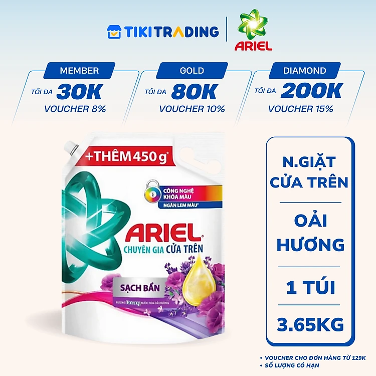 Túi Nước Giặt ARIEL Chuyên Gia Cửa Trên Ngăn Lem Màu - Hương Lavender 3.65KG