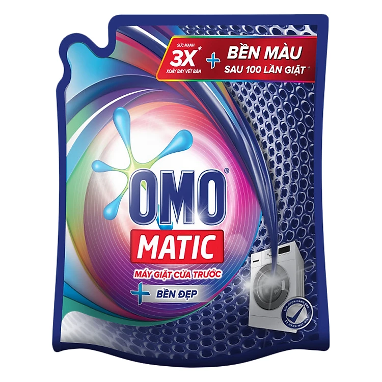 - Nước Giặt Cửa Trước Omo Matic Bền Đẹp (2.7Kg / Túi) - EL có công thức được thiết kế chuyên biệt, hiệu quả cho tất cả các loại máy giặt cửa trước. Sản phẩm tăng cường thêm sức mạnh 3X, giúp xoáy tan vết bẩn cứng đầu hiệu quả trong lồng giặt và mang đến 3 lợi ích vượt trội: làm trắng, làm sáng và xoáy bay hoàn toàn vết bẩn.