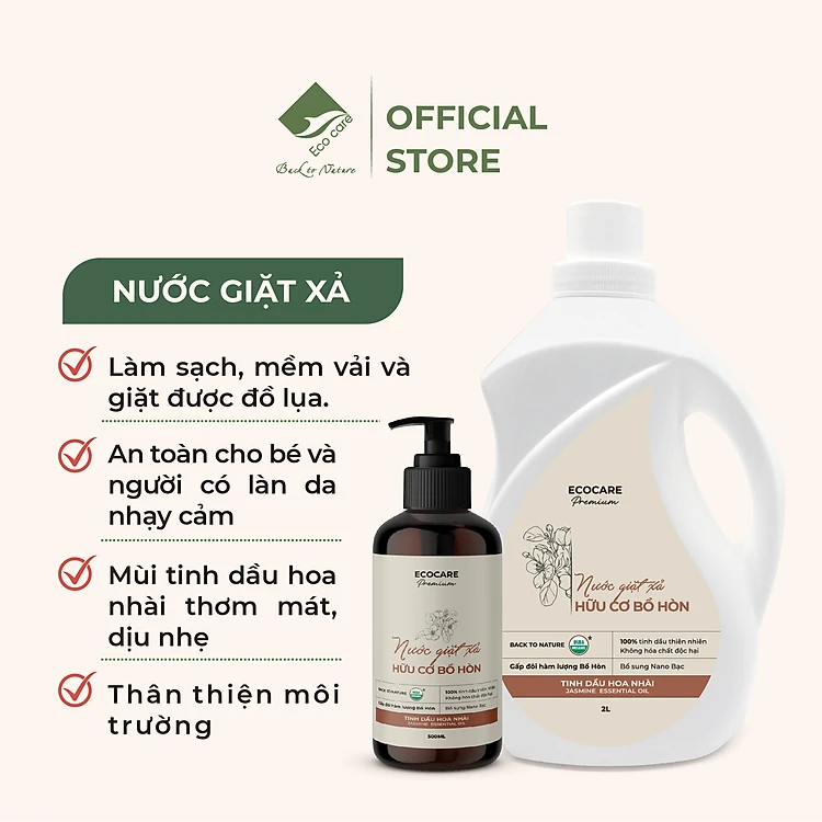 Nước Giặt Hữu Cơ An Toàn Cho Bé Sơ Sinh ECOCARE Chiết Xuất Bồ Hòn Và Tinh Dầu Hoa Nhài 500ml-2L-4L, Dịu Nhẹ Với Da Tay