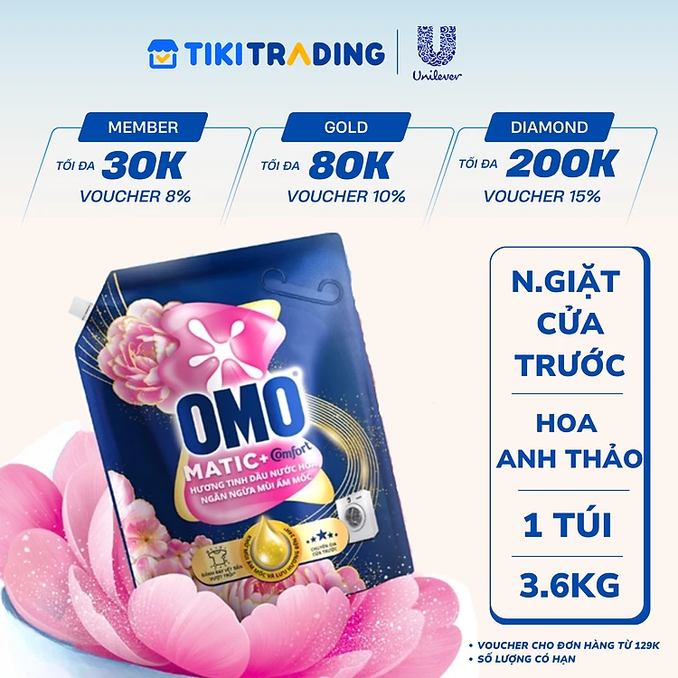 Túi Nước Giặt Omo Matic Cho Máy Giặt Cửa Trước Hương Hoa Anh Thảo Ngăn Mùi Ẩm Mốc 3.6KG