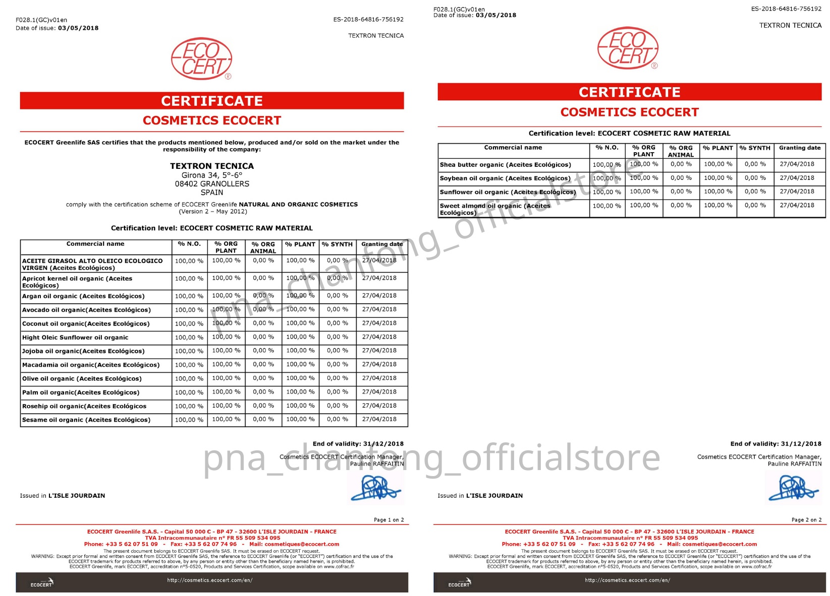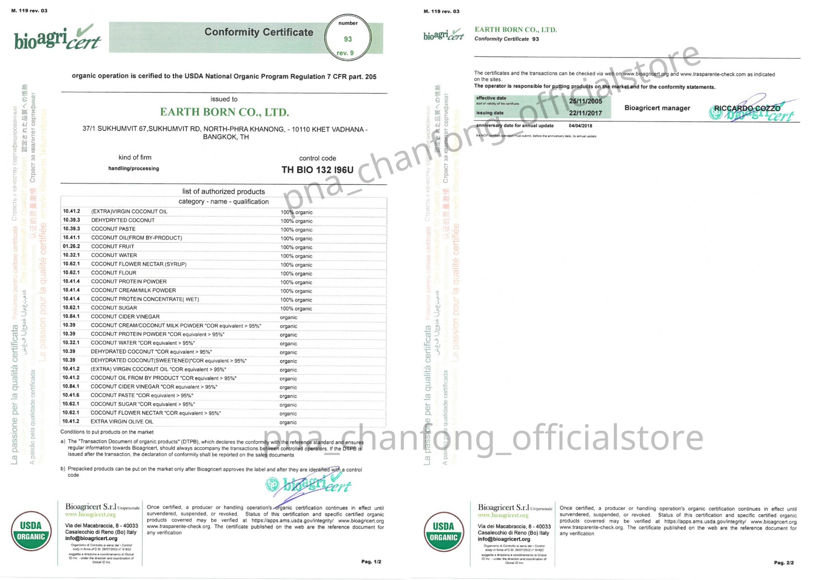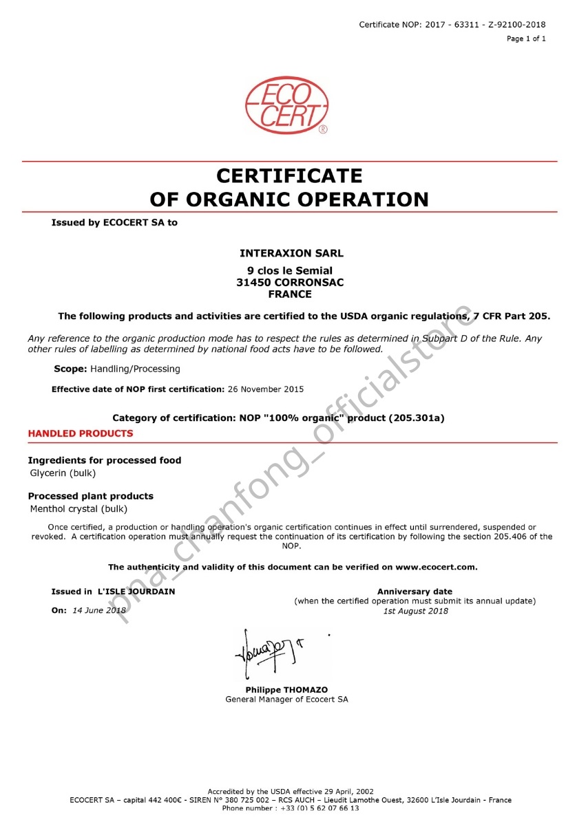 - Được chứng nhận chiết xuất từ nguồn nguyên liệu Organic và chứng nhận Ecocert, USDA đủ tiêu chuẩn xuất khẩu đi Châu Âu