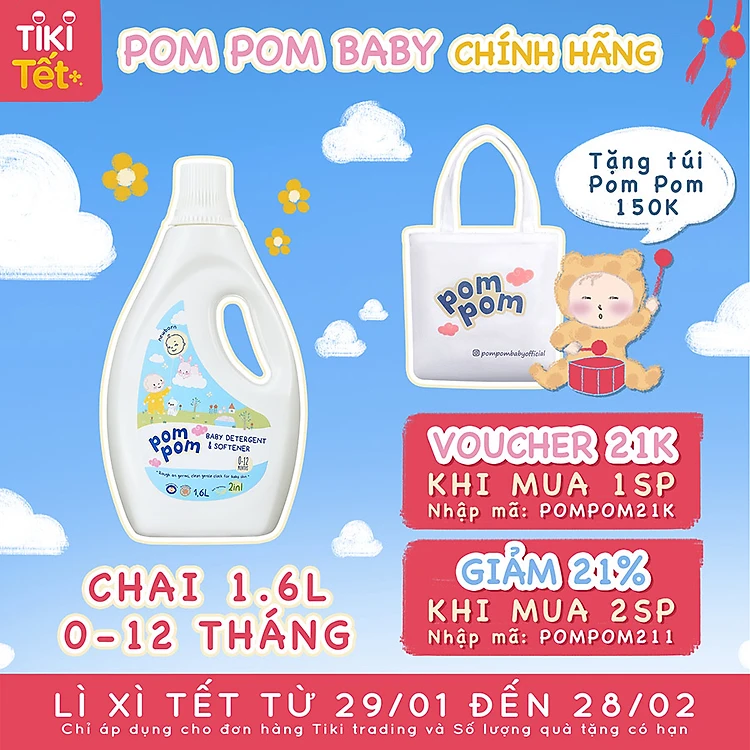 - Nước Giặt Xả Pom Pom chuyên biệt dành cho bé sơ sinh (0-12 tháng) - Chai 1,6L giúp làm SẠCH và MỀM quần áo, tã vải, khăn và chăn cho em bé sơ sinh.