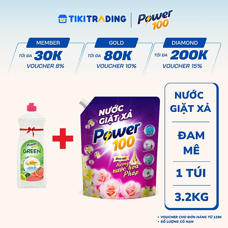 Túi Nước Giặt Xả POWER100 Hương Nước Hoa Pháp 3.2KG