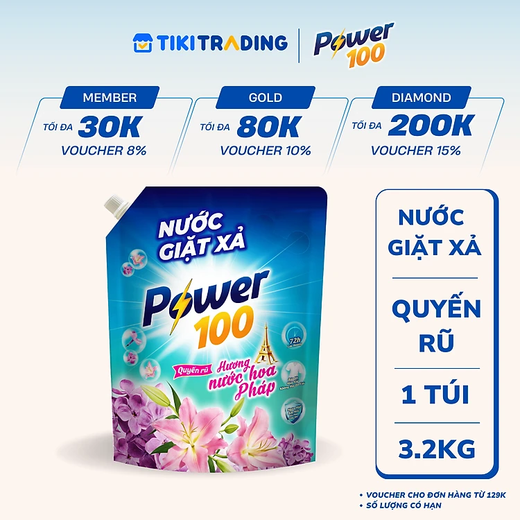 Túi Nước Giặt Xả POWER100 Hương Nước Hoa Pháp 3.2KG