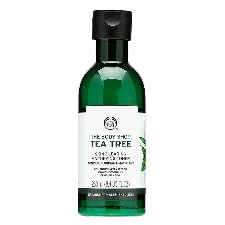 - Nước Hoa Hồng Dưỡng Ẩm The Body Shop Tea Tree (250ml) thích hợp cho làn da dễ bị mụn, giúp rửa trôi đi mọi bụi bẩn và lớp make up thừa trả lại cho bạn làn da sạch sẽ và không còn bóng dầu.