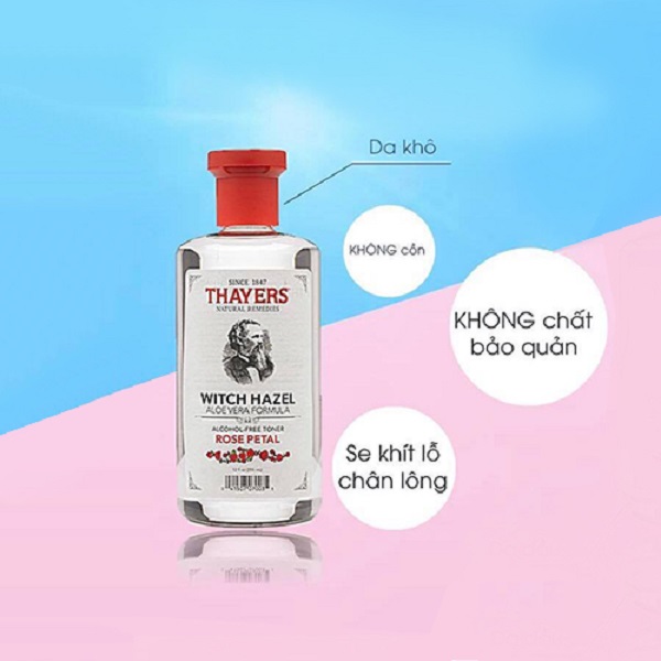 THAYERS với công thức không thức không cồn Alcohol-Free và chiết xuất từ cây phỉ - Witch Hazel là thành phần nổi tiếng lừng danh trong giới Toner. Tuy sản phẩm không chứa cồn nhưng vẫn hoàn thành tốt nhiệm vụ làm sạch mọi bụi bẩn còn sót lại sau bước tẩy trang và sữa rửa mặt mà không hề gây khô da, căng rát da. Ngoài ra,Toner THAYERS còn chứa công thức lô hội và Vitamin E có khả năng làm mềm và dịu da, kể cả làn da nhạy cảm. Nước hoa hồng THAYERS với thiết kế mang phong cách Vintage cổ điển, đơn giản nhưng không quá cầu kì. Dạng chai trong suốt, không màu giúp bạn có thể dễ dàng quan sát bên trong sản phẩm. Với mùi hương đặc trưng, mang lại cảm giác vô cùng khoan khoái và thư giãn khi sử dụng.