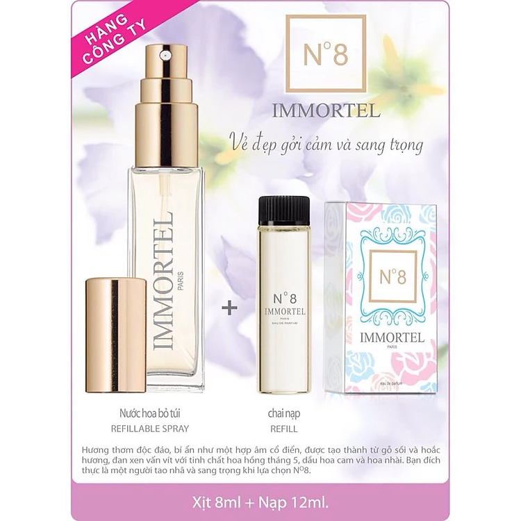 Nước Hoa IMMORTEL No8 (GỒM CHAI XỊT 8ML + CHAI NẠP 12)