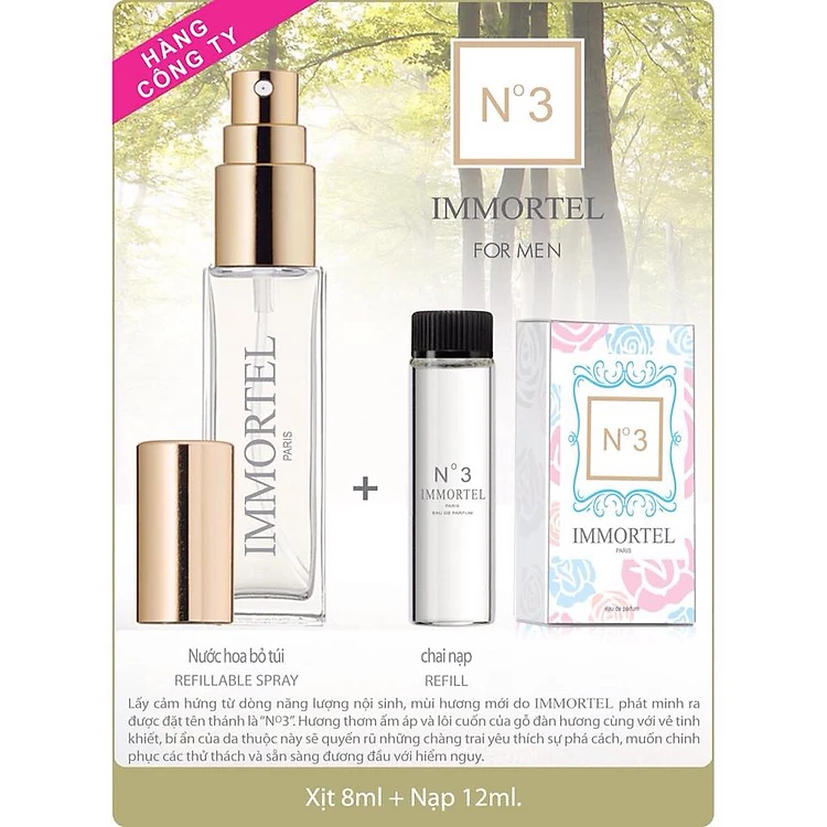 Nước Hoa Nam IMMORTEL PARIS No3 Eau De Perfume (Gồm chai xịt 8ml + Chai nạp 12ml) - Hương thơm ấm áp và lôi cuốn của gỗ đàn hương cùng với vẻ tinh khiết, bí ẩn của da thuộc- Kiểu dáng nhỏ gọn