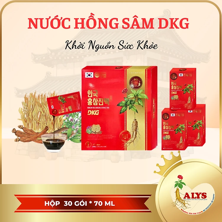Nước hồng sâm DKG chiết xuất từ hồng sâm cô đặc 6 năm tuổi thượng hạng (hàm lượng ginsenoside cao lên tới 70mg/g).