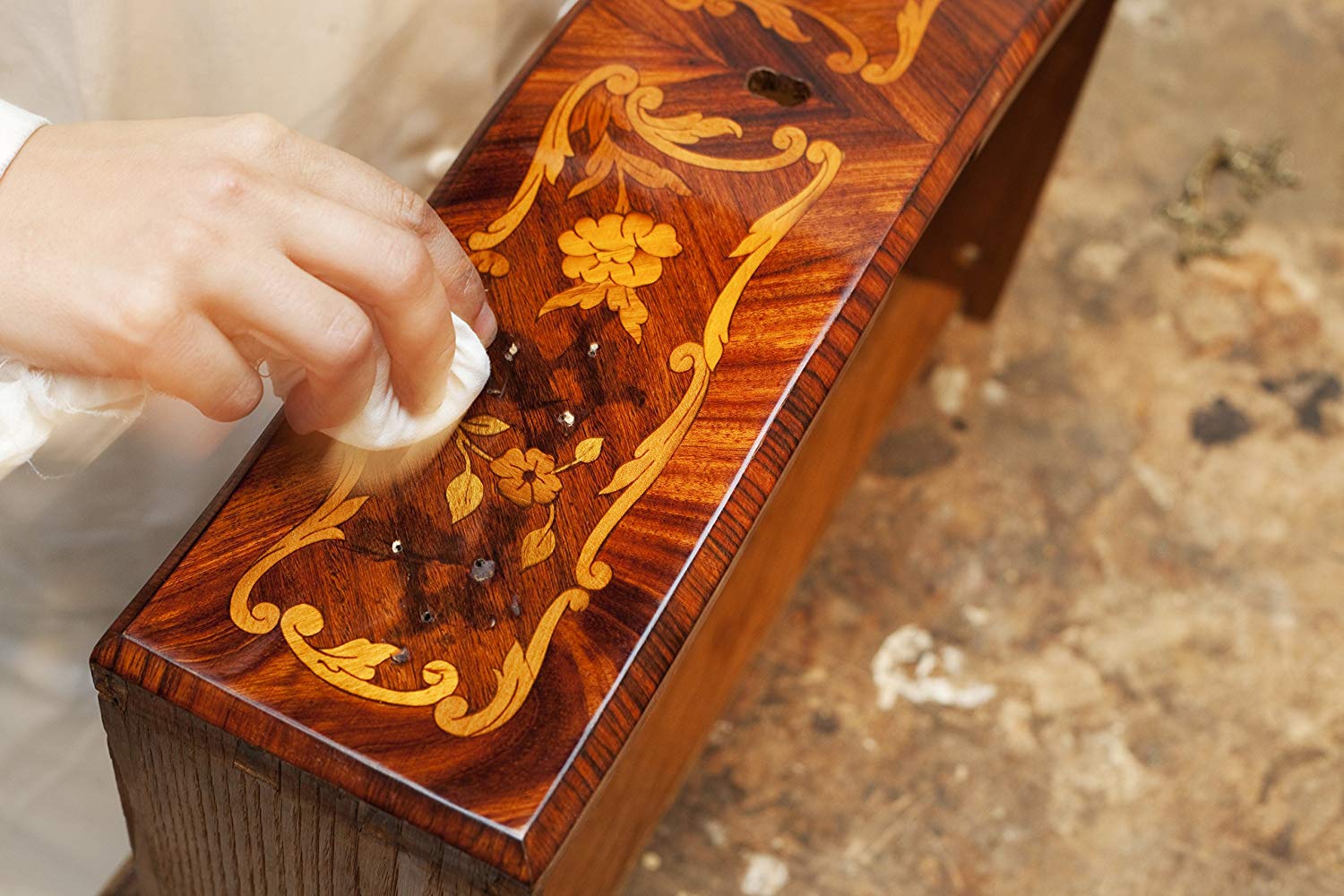 2. Xịt một ít nước tẩy rửa lên miếng vải mềm, lau đều lên bề mặt gỗ.