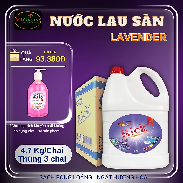 Nước lau sàn Rick 4.7kg (3 chai/ thùng) - Tặng 1 Chai Nước Rửa Tay Zily 500Gr