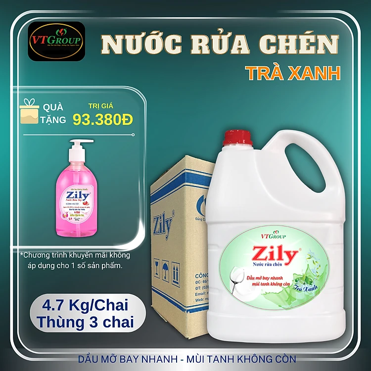 Nước Rửa Chén Zily 4.7 Kg (03 Chai/Thùng) - Tặng 1 Chai Nước Rửa Tay Zily 500Gr