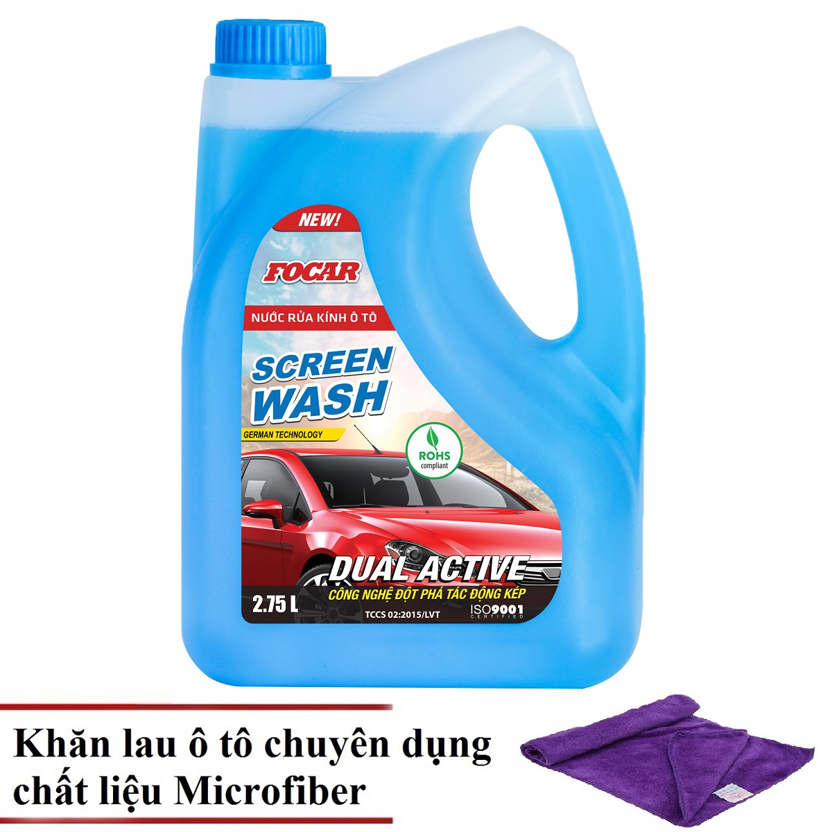Nước rửa kính ô tô Focar Screen Wash 2.75L + tặng kèm 1 khăn lau to chất liệu Microfiber size 30x70cm