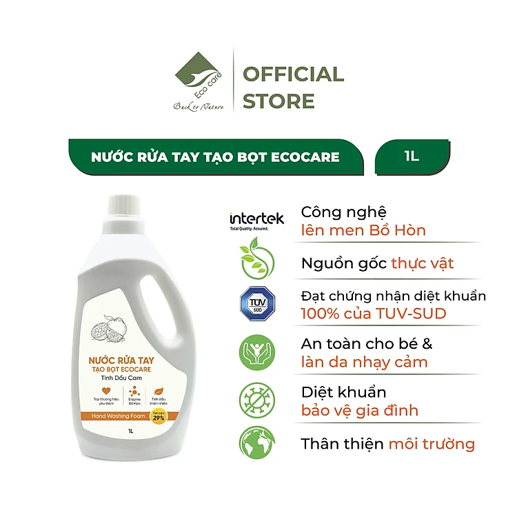 Nước rửa tay Hữu cơ diệt khuẩn dạng bọt Tinh dầu Thiên nhiên Cam/Quế/Nhài 1L thương hiệu ECOCARE ( tặng kèm vỏ tạo bọt)