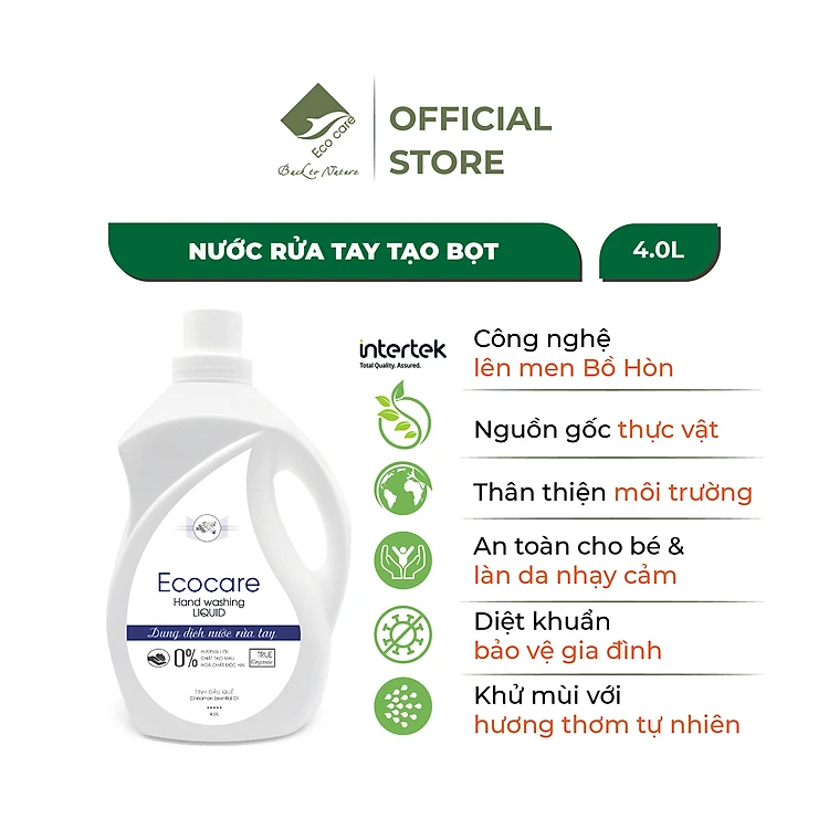 Nước rửa tay hữu cơ diệt khuẩn dạng bọt hương Quế 4L thương hiệu Ecocare