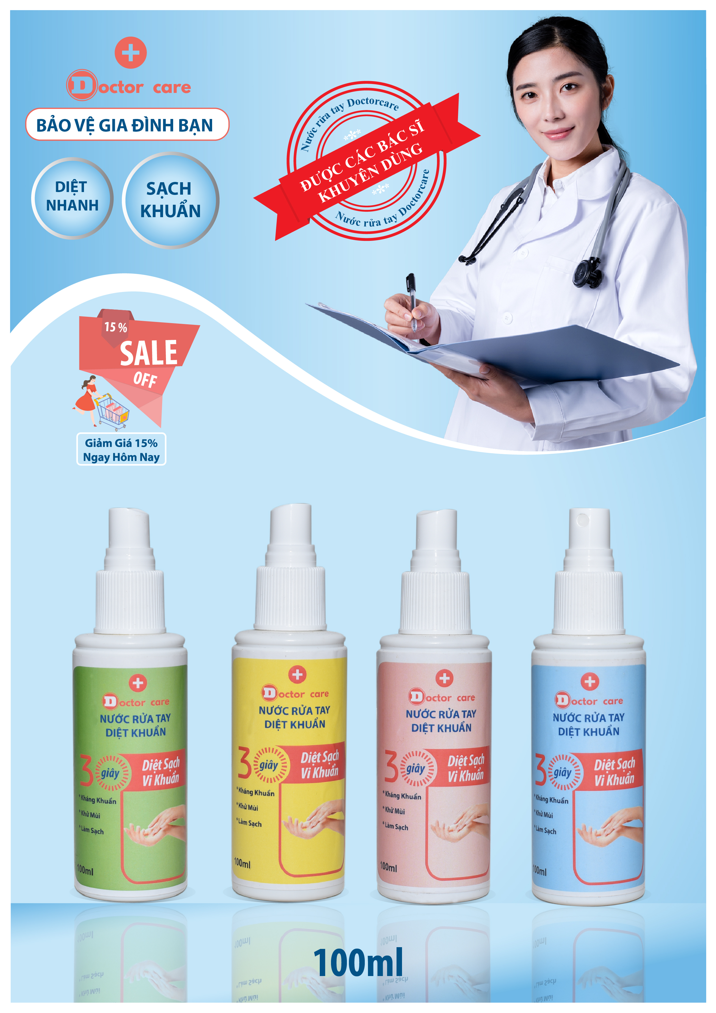 Nước rửa tay khô Doctor Care Có tinh chất dưỡng ẩm không hại da tay. Bay hơi ngay lập tức sau khi sử dụng và không cần rửa lại bằng nước.