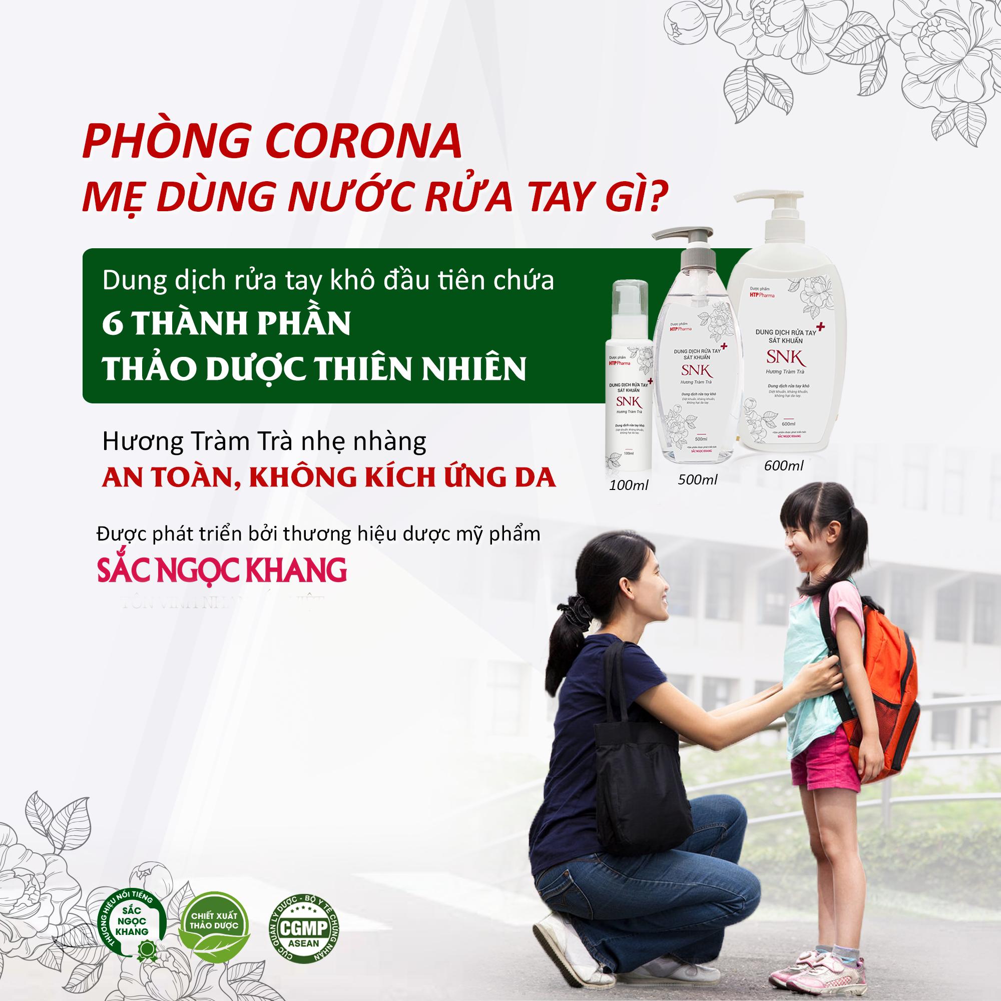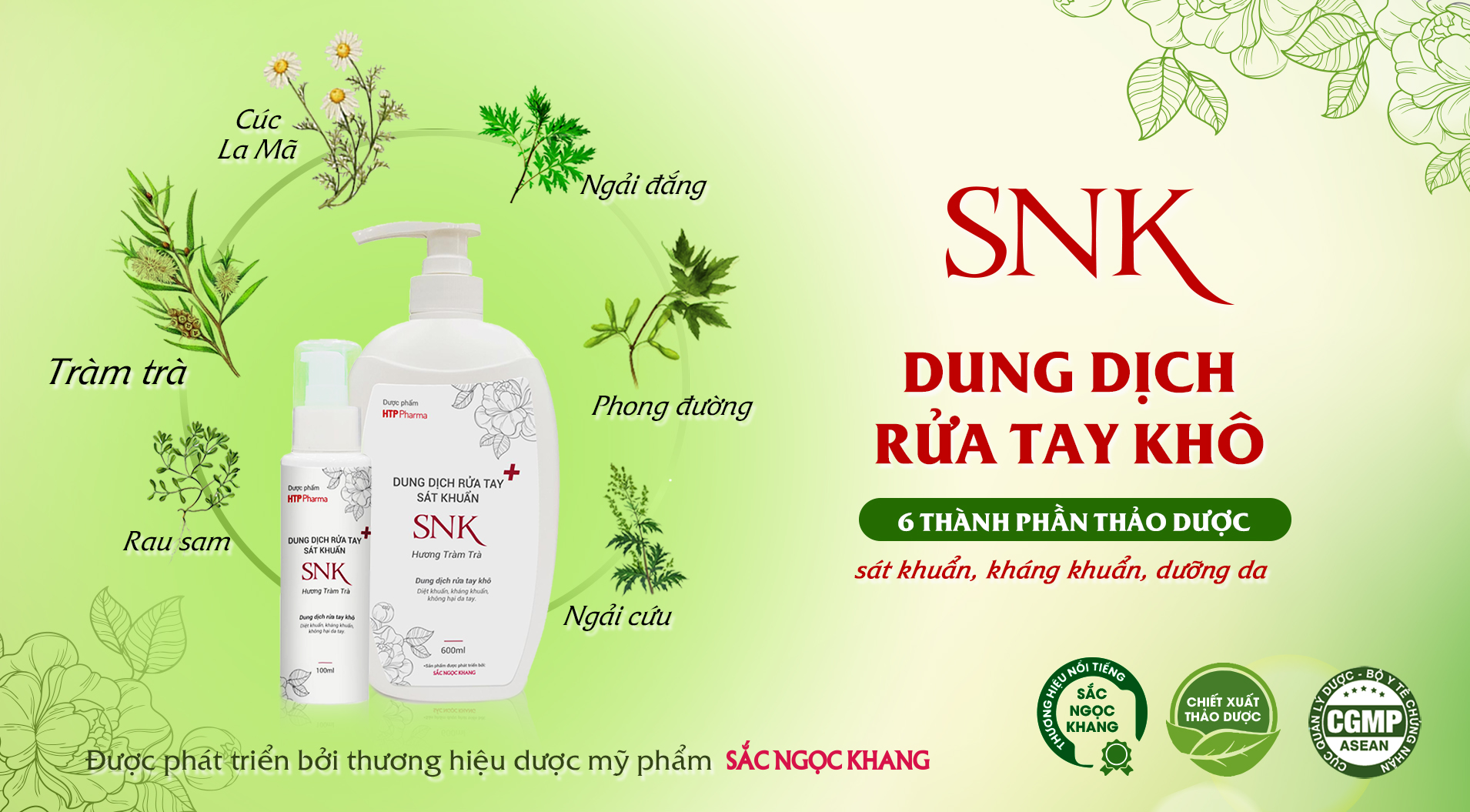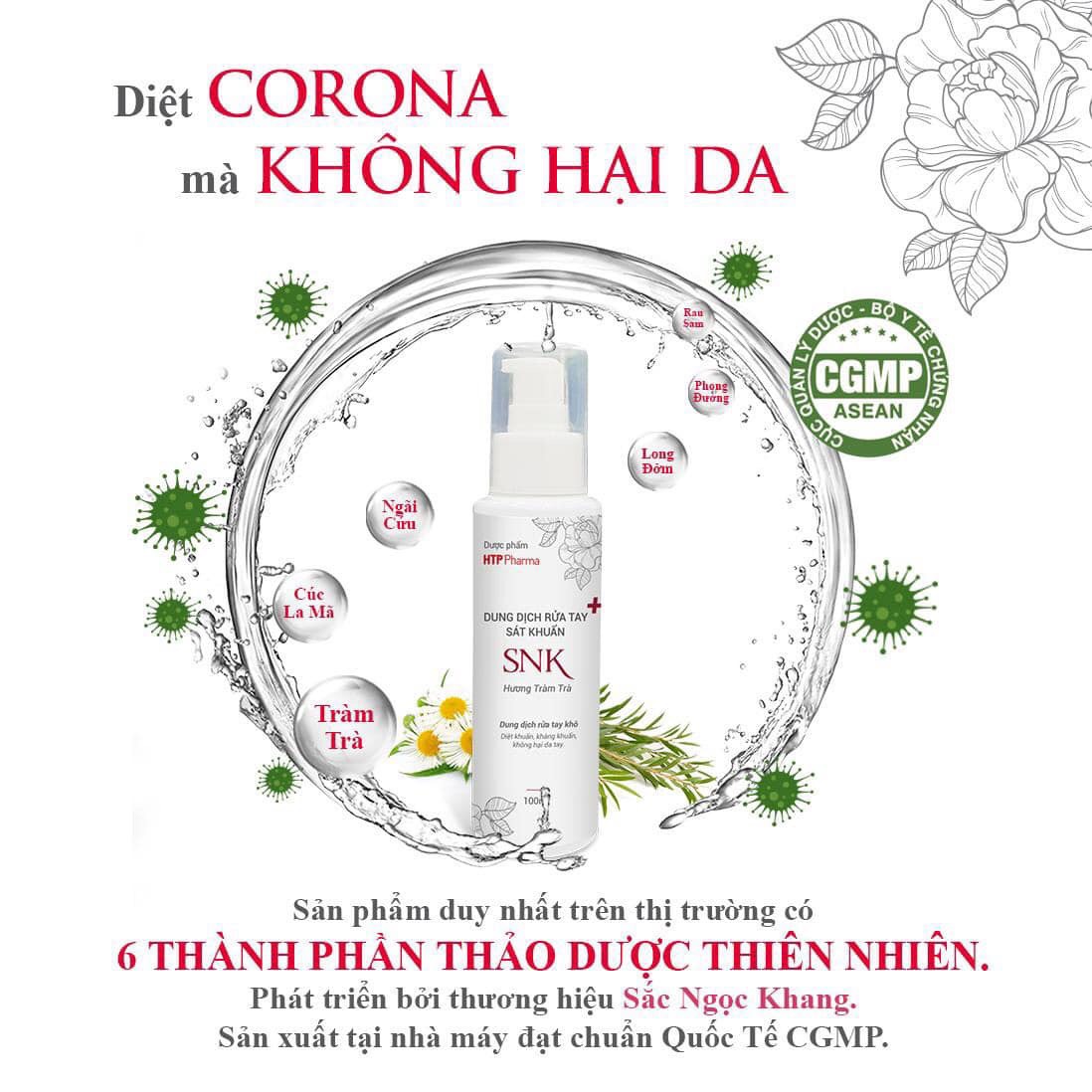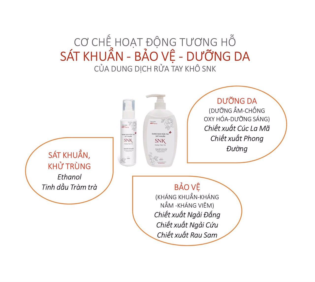 Nước Rửa Tay Khô Diệt Khuẩn Đến 99.99% SNK Sắc Ngọc Khang - Hàng Chính Hãng là sự kết hợp bởi các chiết xuất thảo dược thiên nhiên: tinh dầu Tràm Trà, Cúc La Mã, Phong Đường, rễ cây Ngải Đắng, Ngải Cứu, Rau Sam và Ethanol mang lại khả năng sát khuẩn, dưỡng ẩm cho da tay mềm mịn, khỏe đẹp với hương Tràm Trà tươi mát.