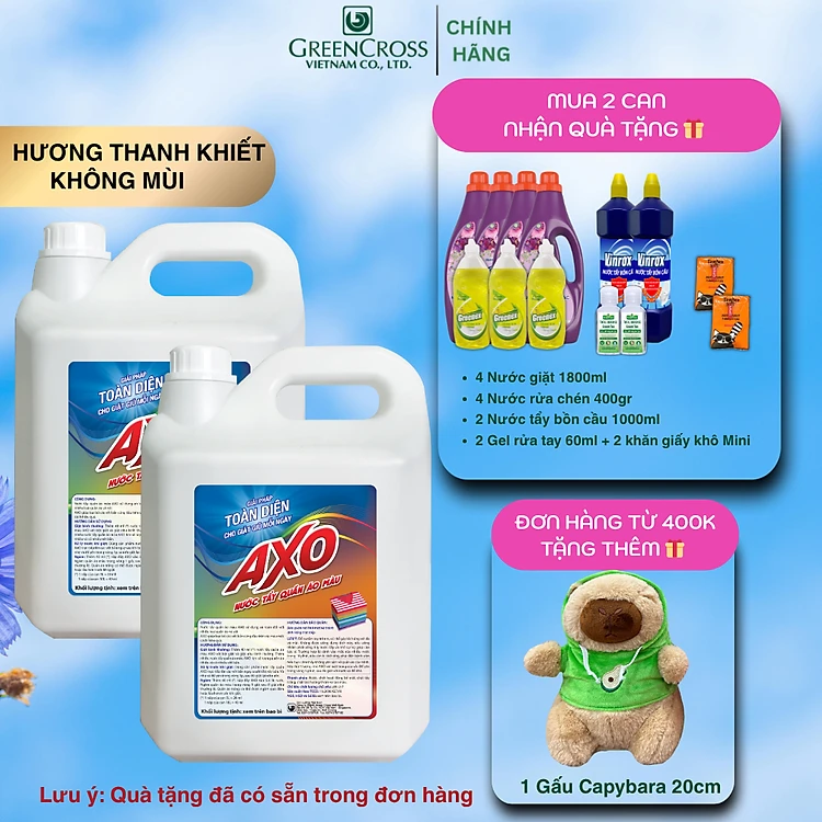 COMBO 2 CAN Nước tẩy quần áo màu đánh bay vết bẩn AXO 5 Lít Tiết Kiệm - Hương Thanh Khiết