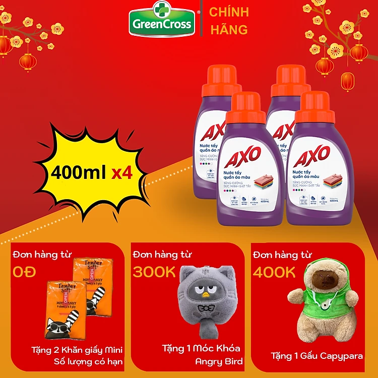 Combo 4 chai Nước tẩy đánh bay vết bẩn cứng đầu cho quần áo màu AXO 400ml
