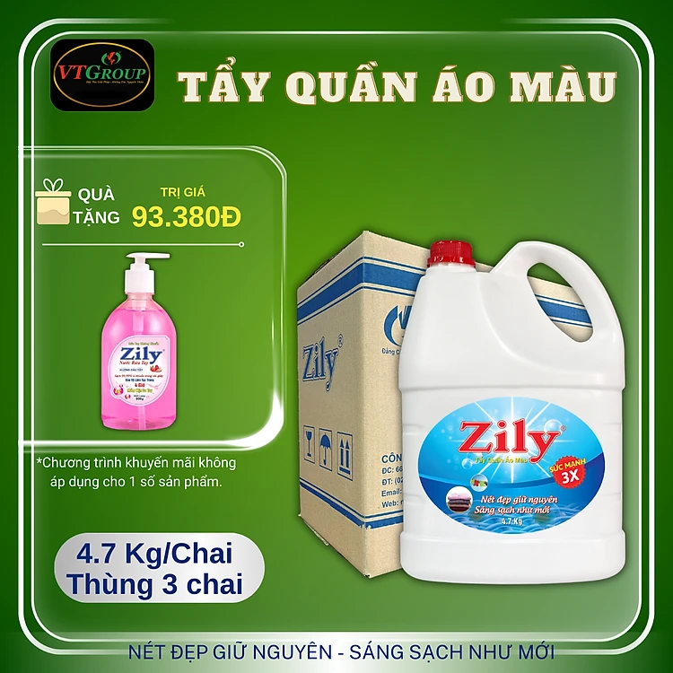Nước Tẩy Quần Áo Màu Zily Chai 4.7Kg - 3 Chai / Thùng ( Tặng 1 Chai Nước Rửa Tay Zily 500Gr)