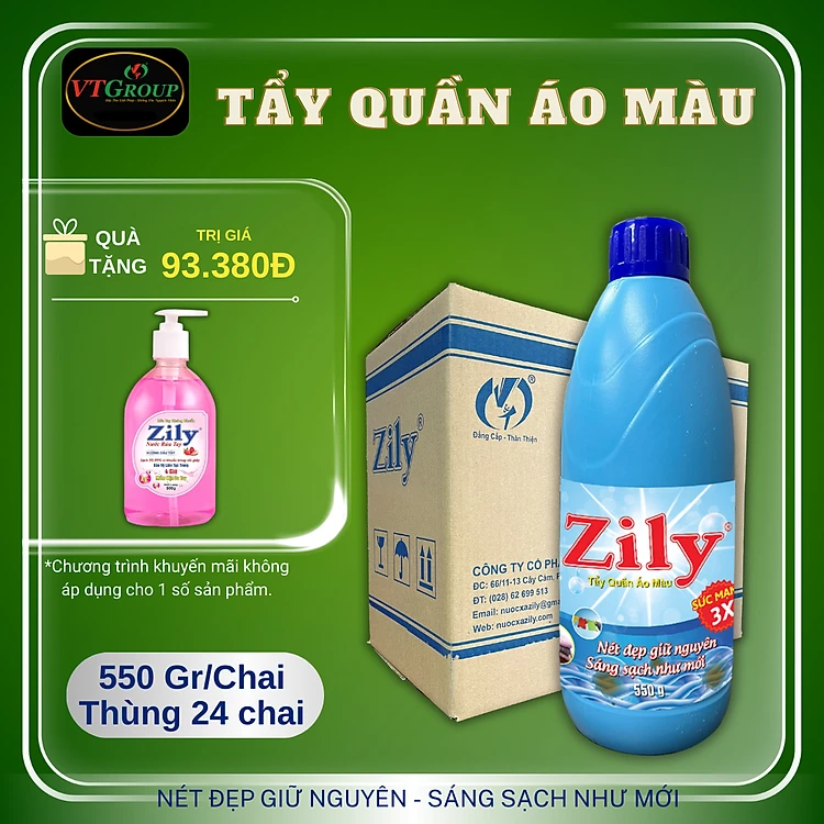 Nước Tẩy Quần Áo Màu Zily Chai 550g - ( Thùng 24 Chai ) - Tặng 1 Chai Nước Rửa Tay Zily 500Gr