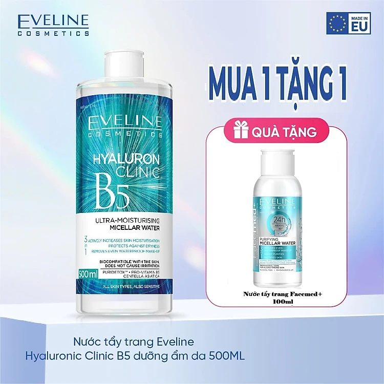 [ Tặng chai 100ml ] Nước tẩy trang Eveline Hyaluron Clinic B5 và tinh chất rau má 3 in 1 500ML