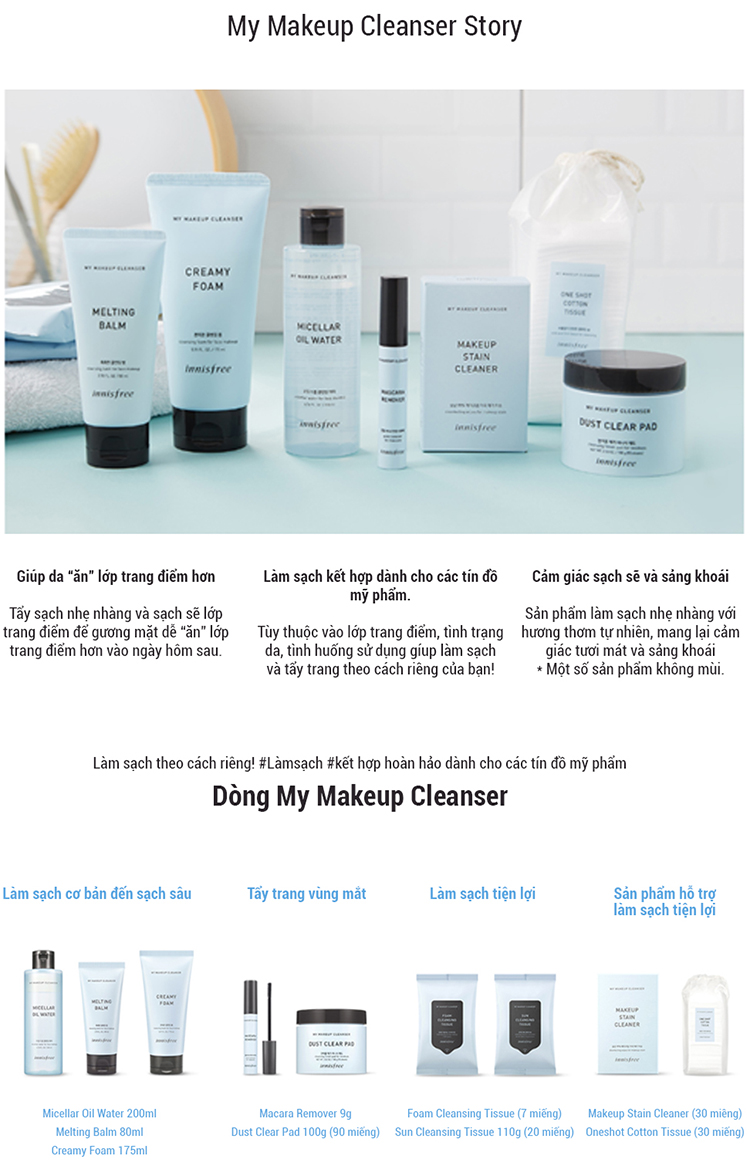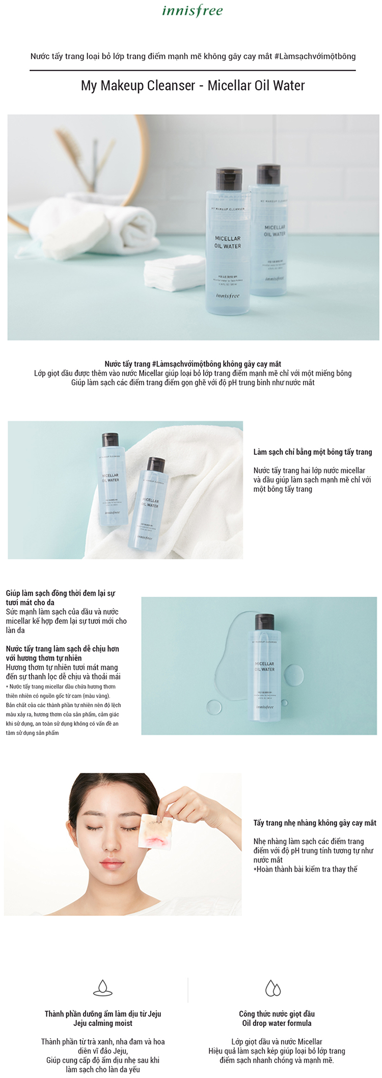 - Nước Tẩy Trang Innisfree My Makeup Cleanser Micellar Oil Water nhẹ nhàng lấy đi lớp bụi bẩn và trang điểm trên da toàn diện chỉ trong một bước.
