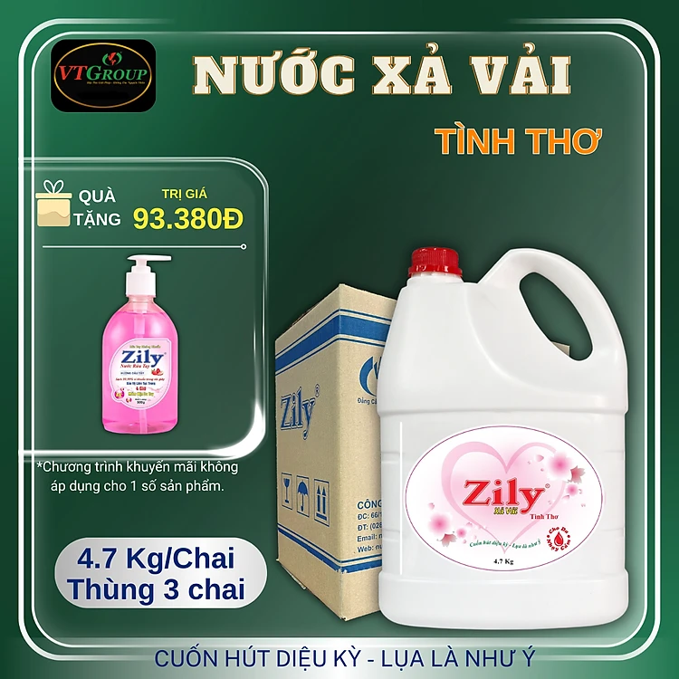 Nước xả vải Zily chai 4.7Kg (3 chai/ Thùng) - Tặng 1 Chai Nước Rửa Tay Zily 500Gr