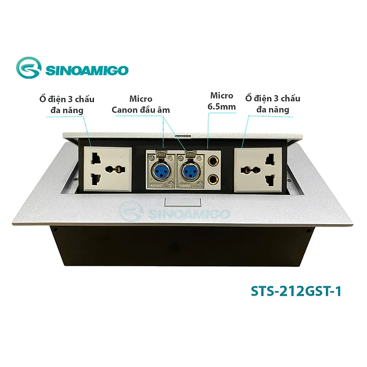 Ổ cắm âm bàn họp Sinoamigo STS-212GST-1 tích hợp điện & cổng âm thanh micro (Canon + 6.5mm)