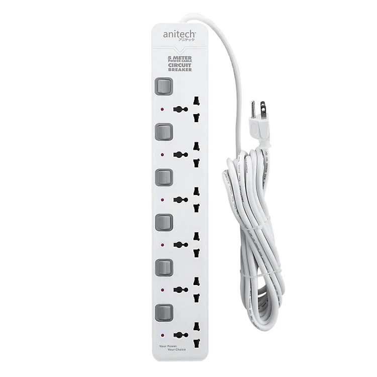 Ổ Cắm Điện 6 Lỗ 3 Chân Công Tắc Riêng Anitech H406 - 5 Mét giúp bạn thuận tiện hơn khi sử dụng cho nhiều thiết bị điện tử cùng một lúc mà không gây ra tình trạng cháy nổ bởi ổ cắm đã được cài đặt hệ thống tự ngắt điện khi dòng điện quá tải. Thiết bị có kích thước nhỏ cùng chiều dài dây điện 5 mét giúp bạn có thể di chuyển cũng như sắp xếp thiết bị gọn gàng hơn và thuận tiện hơn.