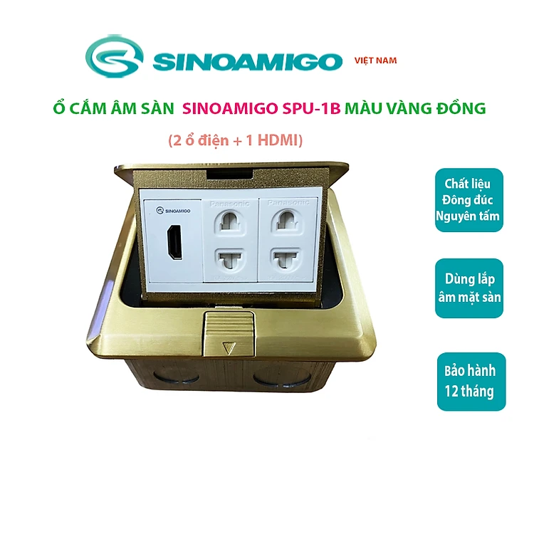 Ổ cắm điện âm sàn Sinoamigo SPU-1B màu vàng đồng, chất liệu đồng đúc nguyên tấm, hạn chế oxy hóa, module lắp theo yêu cầu: Điện, lan, tel, HDMI, GA, USB