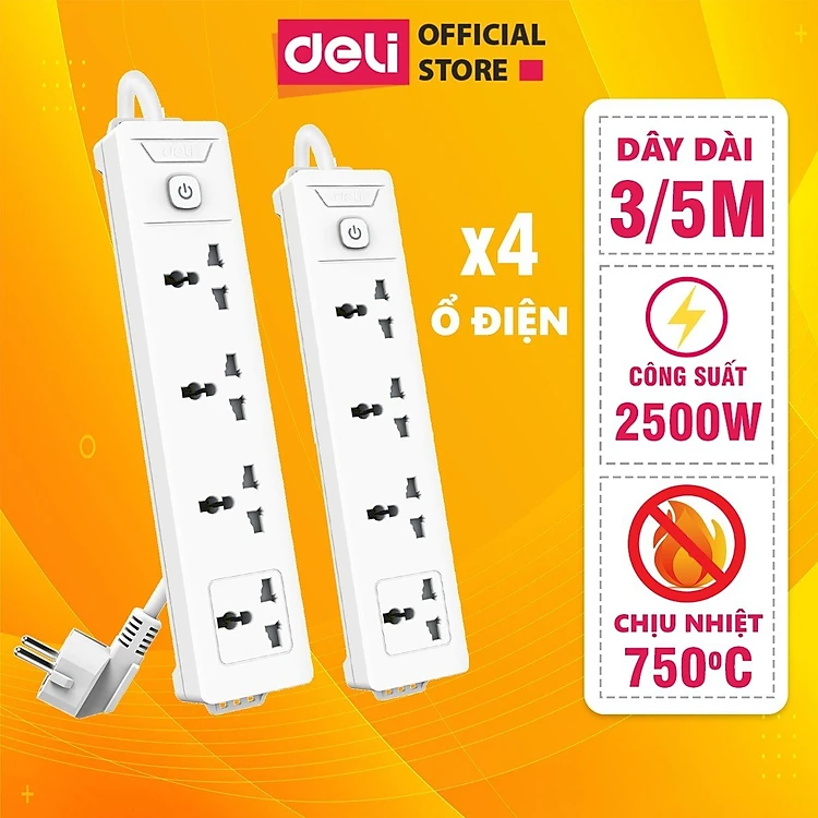 Ổ Cắm Điện Đa Năng 2500W Có Công Tắc Nguồn 3/4/6 Ổ , 3M/5M Dây Chống Giật Chống Cháy Chất Lượng Cao Deli - Phiên Bản Mới Nâng Cấp 2023 - Hàng Chính Hãng - ET401 - 406