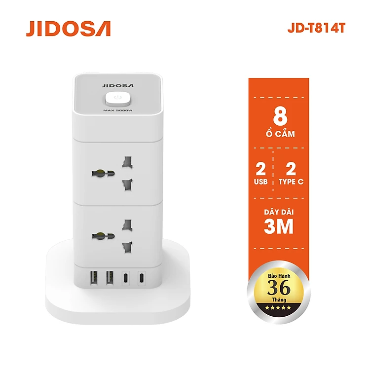 Ổ Cắm Điện JIDOSA Tích Hợp Ổ USB Và Type C Hình Tháp Đa Năng Công suất 3000w Thiết Kế Thông Minh