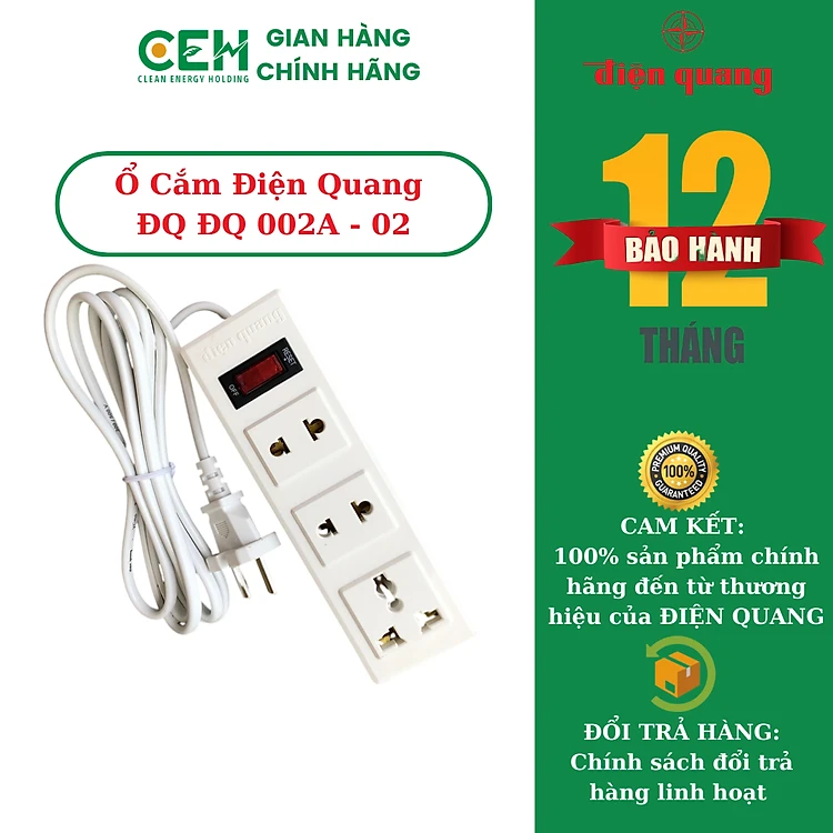 Ổ cắm Điện Quang ĐQ 002A-02 3 lỗ, dài 2 mét và 5 mét, tự ngắt điện khi quá tải, an toàn 99.9% cho người dùng