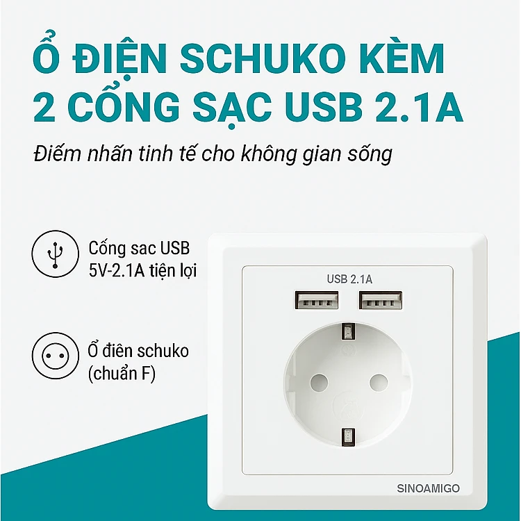 Ổ cắm điện Schuko (chuẩn Hàn Quốc) âm tường kèm 2 cổng sạc USB 5V-2.1A - Sinoamigo SW-1EUA nhập khẩu chính hãng