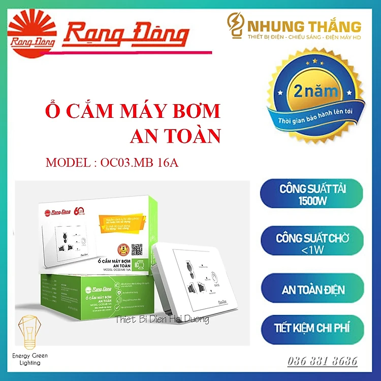 Ổ Cắm Máy Bơm An Toàn Rạng Đông OC03.MB 16A - Ổ Cắm Chống Giật Cấp N guồn 5V Cho Phao Điện - Công Suất 1500W