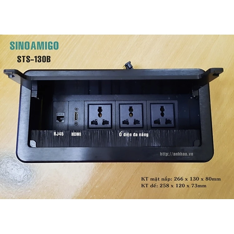Ổ điện âm bàn văn phòng Sinoamigo STS-130B màu đen, thiết kế nắp lật, mặt nắp nhôm xước dễ bền đẹp, Ổ cắm lắp theo yêu cầu: điện, lan, tel, hdmi, vga, usb sạc
