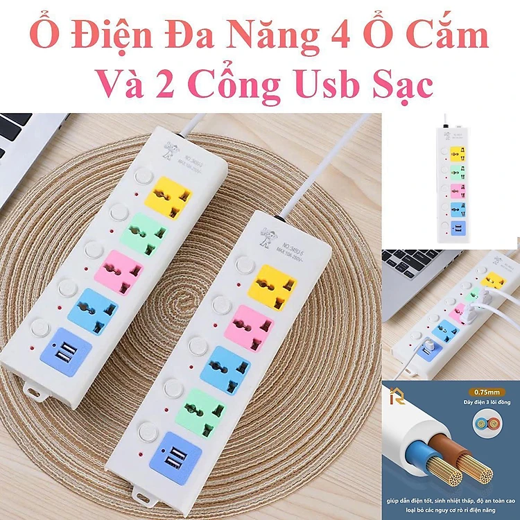 Ổ Điện Thái Lan Đa Năng 4 Ổ Cắm Và 2 Cổng Usb Sạc Dây Dài 1M5 Tiện Dụng