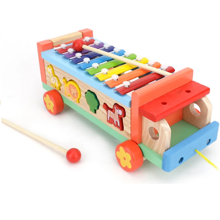 Một bộ sản phẩm gồm 1 chiếc ô tô nhỏ được làm bằng gỗ, hai bên thân có khoét các lỗ nhỏ hình các con vật mà nhiều bé yêu thích. Bên trên được gắn 8 thanh kim loại nhẹ sơn màu và đánh các ký tự chữ cái khác nhau. 2 que gõ nhỏ được thiết kế tinh tế giúp bé dễ cầm nắm khi chơi. Các khối hình được cắt CNC có hình dáng các con vật ngộ nghĩnh: con ngựa, con voi, con hà mã, con cá sấu…