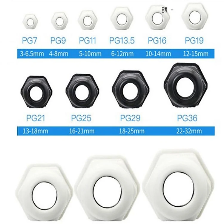 Ốc xiết cáp nhựa PG là loại Ốc xiết cáp bằng nhựa, dùng để bảo vệ cáp điện khi đấu nối vào tủ điện, tránh chạm vỏ tủ điện gây xước cáp và bọc kín điểm đi dây vào tủ. Có các cỡ ốc nhựa khác nhau có các mã từ bé đến lớn theo bảng dưới, bao gồm: PG7, PG9, PG11, PG13.5, PG16, PG19, PG21, PG25, PG29, PG36, PG42, PG48, PG63